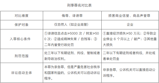 刑事逃责的焦点方针是“逃查侵权人刑事义务,构成”,合用于“侵权情节严沉、形成严沉丧失”的景象,需严酷满脚入罪前提。《中华人平易近国刑法》第二百四十六条:以或者其他方式公开他人或者现实他人,情节严沉的,处三年以下有期徒刑、、管制或者。前款罪,告诉的才处置,可是严沉风险社会次序和国度好处的除外。通过消息收集实施第一款的行为,被害人向告诉,但供给确有坚苦的,能够要求机关供给协帮。本罪位于“人身、罪”一章,仅天然人的人身,不间接企业名望。若舆情针对企业高管小我(如“高管收受行贿”),且满脚“情节严沉”前提,能够逃查者的刑事义务。关于本罪的入罪尺度,根据《最高、最高人平易近查察院关于打点操纵消息收集实施等刑事案件合用法令若干问题的注释》第二条:①统一消息现实被点击、浏览次数达到五千次以上,或者被转发次数达到五百次以上的;②形成被害人或者其近亲属变态、、等严沉后果的;③二年内曾因受过行政惩罚,又他人的;④其他情节严沉的景象。因而,企业或者高管小我正在预备刑事时,需要参考固定电子数据的方式,及时且精确地将固定,以便于后续向法院提告状讼。值得留意的是,本罪为亲陪罪,需要被害者本人向法院提告状讼,可是当、行为“严沉风险社会次序和国度好处”时,可由公诉机关提告状讼。《关于打点操纵消息收集实施等刑事案件合用法令若干问题的注释》中对于“严沉风险社会次序和国度好处”的定义包罗“激发群体性事务的;激发公共次序紊乱的;多人,形成恶劣社会影响的;损害国度抽象,严沉风险国度好处的”,可见两高并没有给出一个量化的法则,而用宽泛的描述,这也导致正在司法实践中对于启动公诉法式的尺度也存正在恍惚之处。从司法实践来看,罪的自诉结果并不抱负,正在收集名望侵权案件中,被害人举证的难度大。被害人至多需要就以下现实进行举证:自账号的从体身份是谁?视频/文章点击量几多?能否达到刑事立案尺度?几多人对该视频进行了转发?而对此类电子的取证,需要微信办事供给商协帮查询拜访,没有公机关的协帮和共同,底子无法完成。因而,笔者也企业正在查询拜访的同时,测验考试取机行沟通,证明舆情曾经达到“严沉风险社会次序和国度好处”的法式,请求机关立案侦查,推进本案进度。相关案例:2019 年,湖北籍须眉云某为获取流量收益,正在新浪微博账号 “黑漫趣评” 上多益收集董事长徐波 “醉酒上传不雅观视频大公司群” 等虚假消息,并通过微信群扩散。该导致多益收集股价波动、贸易诺言受损,徐波小我名望严沉贬损。广州市黄埔区审理后认为,云某的行为同时罪取损害贸易诺言罪,最终数罪并罚判处其有期徒刑一年三个月。《中华人平易近国刑法》第二百二十一条,损害贸易诺言、商品声誉罪,是指并现实,损害他人的贸易诺言、商品声誉,给他人形成严沉丧失或者有其他严沉情节的行为,处二年以下有期徒刑或者,并处或者单惩罚金。分歧于平易近事的贸易,本罪的犯罪从体为一般从体,并不要求是运营者,更不要求其取企业存正在合作关系。其次,贸易中的舆情可能是“性消息”,而本罪则明白要求“并现实”,对于舆情的性质要求分歧。最初,就客不雅要件而言,本罪要求居心,贸易则可能由导致。关于本罪的入罪尺度,根据《最高人平易近查察院、关于机关管辖的刑事案件立案逃诉尺度的(二)》第六十六条:①给他人形成间接经济丧失数额正在五十万元以上的;②虽未达到上述数额尺度,但形成公司、停产六个月以上,或者破产的;③其他给他人形成严沉丧失或者有其他严沉情节的景象。一般来看,公司一般会按照第一款组织,证明公司蒙受的间接丧失,向机关提起刑事,笔者公司能够汇集舆情发生前后,门店发卖额的变化、商品销量的变化等客不雅,来证明舆情给公司带来的间接丧失。需要时,该当引入第三方律师、会计师事务所供给指点。典型案例:(2021)粤1502刑初181号:被告人江某流因对工做不满,正在“妈妈帮”APP上注册昵称为“垃圾核心”的账号,并于2020年11月1日、2020年11月2日、2020年11月24日多次正在“妈妈帮”APP他人征询汕尾某月子核心环境的帖子中,跟帖“这华恩月子核心仿佛坐月子把婴儿弄死了”“吃月子核心的食物后拉肚子”等虚假言论。最终,法院认为被告人江某流犯损害贸易诺言罪,判处有期徒刑八个月,并惩罚金人平易近币二千元。