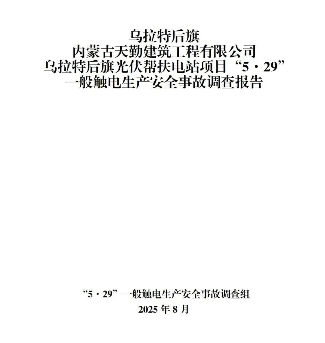 11月24日,乌拉特后旗人平易近发布乌拉特后旗天勤建建工程无限公司乌拉特后旗光伏帮扶电坐项目“5·29”一般触电出产平安变乱查询拜访演讲:按照查询拜访演讲:2025年5月29日10时15分摆布,天勤建建工程无限义务公司正在乌拉特后旗光伏电坐帮扶项目施工过程中,发生一路施工人员触电变乱,形成1人灭亡。