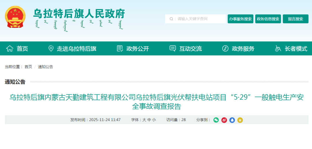 经查询拜访认定:天勤建建工程无限义务公司乌拉特后旗光伏帮扶电坐项目“5·29”一般触电出产平安变乱是功课人员违反操做规程带电操做、不佩带劳动防护用品导致的一路出产平安义务变乱。
