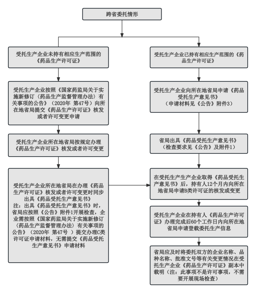 为进一步明白药品委托出产许可相关事项的打点法式,确保各省法式规范同一,《通知布告》明白了省内开展委托出产无需打点《药品受托出产看法书》,可同步打点委托(B类)和受托(C类)药品出产许可事项。对于跨省委托出产的,明白了“先B后C”的总体打点准绳,即受托出产企业申请《药品受托出产看法书》后,先由持有人所正在地省局打点B类药品出产许可事项,之后受托出产企业所正在地省局再按照持有人所正在地省级药品监视办理部分审批环境,将委托出产的细致消息到受托出产企业《药品出产许可证》副本中。对于尚未持有响应出产范畴《药品出产许可证》的景象,《通知布告》明白该当先按照《国度药监局关于实施新修订〈药品出产监视办理法子〉相关事项的通知布告》(2020年第47号)打点C类药品出产许可,同步打点《药品受托出产看法书》,之后再按照“先B后C”挨次打点,具体流程拜见下图!