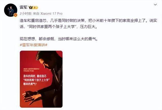 9月24日上午,小米集团董事长兼CEO雷军正在微博发文称,制车和沉启制芯几乎是同时做的决策,把小米前十年攒下的家底全押上了。说实话,“同时供家里两个孩子上大学”,压力庞大。现正在想想城市感伤,其时哪来这么大的怯气。