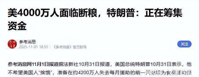有人可能感觉停摆就是公事员放假,取通俗人没什么关系,但此次停摆的影响确实波及到了美国社会的方方面面。精确来说,4170万美国人的食物补帮被中缀了,这相当于美国总生齿的九分之一,也就是说,每九个美国人中就有一小我要为下一顿饭忧愁。中国人常说“平易近以食为天”,这对于美国的通俗来说,无疑是一个难以承受的冲击。
